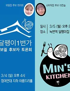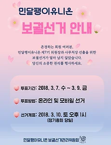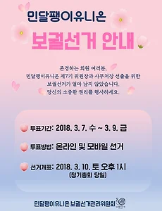 전체 글900 [공고] 2018년 민달팽이유니온 7기 임원보궐선거 선거권자 정수 확정 및 투표 안내 [2018년 민달팽이유니온 7기 임원 보궐선거] [선거권자 정수 확정 및 투표 안내] 규약 제 10조에 의하여 3개월 이상 회비 납부를 하였거나, 선거일 직전 3개월의 회비를 미납하지 않은 회원에 따라 아래와 같이 피선거권자를 확정합니다. * 선거관리위원회에서는 이를 위해 선거기간 확정 전인 2월 초, 미납회원들께 유선전화를 통하여 이와 관련한 회원 권리 회복에 대하여 안내드렸습니다. 그 과정에서 의결권을 포기하신 회원&조합원을 제외하였고, 후보자등록기간 마감일인 2018.2.27을 기준으로 선거인 명부를 확정하였습니다. 선거인 명부에 있어야 하는데 없거나, 여타 문제가 있으신 회원&조합원분들께서는 민달팽이유니온 사무실 (070-4145-9120) 또는 아래 링크에 댓글을 남겨주시기 바랍니다. 1. 선거.. 2018. 3. 2. [2018 보궐선거] 후보자 토론회 및 선거운동 행사 안내 [민달팽이 유니온 7기 임원 보궐선거] 후보자 토론회 및 간담회 안내 안녕하세요. 민달팽이유니온 선거관리위원회입니다. 최지희, 이한솔 후보자의 활동계획서와 약력을 공고드렸지만, 회원들께서 소중한 한 표를 행사하시기 전에 두 분에 대한 더욱 많은 정보와 이야기를 들으실 수 있도록 아래의 행사를 준비했습니다. 회원 여러분의 많은 참여 부탁드리겠습니다! [토론회] 7기 보궐선거 후보자 토론회 ㅇ 토론회를 통해 후보자들의 계획과 포부를 듣고 질문하는 시간ㅇ 일시 : 2018.3.4(일) 오후 4시ㅇ 장소 : 참여연대 지하 느티나무홀 [간담회] 민유 조합원과 후보자가 함께 하는 ㅇ 토론회에서 못다한 이야기를 함께 식사하며 조금 더 편하게 나누는 시간ㅇ 일시 : 2018년 3월 5일(월) 오후 7시 30분ㅇ 장소 .. 2018. 3. 1. [2018 보궐선거] 선거안내 2018. 3. 1. [2018 보궐선거] 후보자 포스터 2018. 3. 1. 이전 1 2 3 4 5 6 7 8 ··· 225 다음