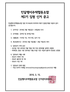 [민달팽이주택협동조합]/* 공지사항69 [수정공고][민달팽이주택협동조합 임원 선거 재공고] [민달팽이주택협동조합 임원 선거 재공고] 안녕하세요! 민달팽이주택협동조합 선거관리위원장 조현준입니다. 2월 15일자로 민달팽이 주택협동조합의 제2기 임원 선거 공고 안내를 드렸는데요, 후보자 등록기간이 변경되어서 선거공고를 재공고하려고 합니다. 본래 후보자 등록기간은 2016년 2월 15일(월) ~ 2월 17일(수) 18시까지였으나 하루 연장된 2월 18일(목) 18시까지 후보자 등록을 진행하도록 하겠습니다. 따라서 변경된 후보자 등록기간은 2016년 2월 15일(월) ~ 2월 18일(목) 18시 까지 입니다. 또한, 후보자 프로필 및 관련 정보는 등록이 끝나는 18일 오후 18시에 안내가 나갈 예정입니다. 선거진행에 작은 차질이 빚어진점, 진심으로 사과드립니다. * 선출 임원 - 민달팽이주택협동조합 이.. 2016. 2. 17. [민달팽이주택 협동조합] 2기 임원 선거 공고 [민달팽이주택협동조합 임원 선거 공고] 안녕하세요! 민달팽이주택협동조합 선거관리위원장 조현준입니다.민달팽이 주택협동조합 제2기 임원 선거를 위해 선거관리위원회가 구성되었고, 다음과 같이 선거 내용을 안내해드립니다. 여러분들의 많은 참여와 관심 부탁드립니다. 궁금하신 사항이나 문의하실 내용이 있다면 전화나 메일로 연락을 주시면 감사하겠습니다. * 선출 임원- 민달팽이주택협동조합 이사장 1명, 이사 9명, 감사 1명 (임기 1년) * 선거 일정- 후보자 등록 : 2016년 2월 15일(월) ~ 2월 17일(수) 18시- 선거운동 : 2016년 2월 18일(목) - 투표기간 : 2016년 2월 19일(금) ~ 2월 20일(토) 13시- 선거개표 : 2016년 2월 20일(토) 14시 청년허브 (민달팽이주택협동.. 2016. 2. 15. [모집] 뭐라도 탐사대의 자세한 일정과 활동을 소개합니다! 뭐라도 탐사대 달팽이집 3호를 고치고 꾸미는 조합원 모임입니다. 리모델링과 인테리어를 같이 해보고 조금씩 손을 보태면서 민달팽이유니온을 튼튼하게 만들어가기 위해 ‘뭐라도’ 해보려고 합니다. 12월 11일(금) 오후 6시 ~ (불금) 청소하는 날, 리모델링 전 집을 말끔하게 쓱싹쓱싹12월 12일(토) 오전 11시 ~ 오후 9시 색을 입히는 날, 벽과 문을 새롭게 페인트로 반질반질12월 13일(일) 오전 11시 ~ 오후 6시 테라스 꾸미는 날, 2층 테라스를 상상력으로 가득가득장소 성북구 동선동1가 85-62 (성신여대입구역 1번 출구 3분 거리)신청 http://bitly.com/뭐라도탐사대*원하는 시간에 잠깐씩 들렸다가 가셔도 되어요.*꼭 무언가를 잘하지 않아도 좋아요. 마음만 있으면 돼요.*뭐라도 탐사.. 2015. 12. 7. [모집] 뭐라도 탐사대, 달팽이집 3호로 출발합니다! 하나, 둘, 함께 채워나가는 달팽이집3호! 그곳으로 "뭐라도 탐사대"가 출발합니다! "뭐라도탐사대"가 뭐에요? 달팽이집 3호에 '뭐라도''라는 작은 섬을 만들 예정이에요. 그 섬은, 입주자들에게 안락한 휴식 공간이자 비입주조합원도 가끔씩 드나들 수 있는 공간이지요. 그렇게 만들어진 틈은 '공유 공간'이 되고 우리 조합의 소중한 자산이 되겠지요. 뭐라도탐사대는 그러한 공유의 '뭐라도'를 같이 만들어가는 탐사대입니다. 구체적으로는 입주조합원들이 안정적으로 입주할 수 있도록 워크샵을 진행하고, 실제로 집을 고치는 리모델링을 해보는 경험까지 해보려고 해요. 다양한 분을 기다려요. 뭐든 보태고 싶은, 뭐라도 해보고 싶은 회원과 조합원을 환영합니다. 왜 하려고 해요? 달팽이집 3호는 조합원 모두가 사는 집은 아니지.. 2015. 11. 27. 이전 1 ··· 11 12 13 14 15 16 17 18 다음