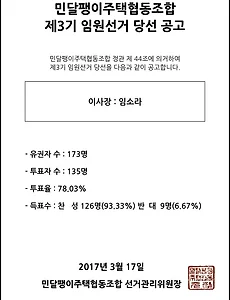 민달팽이주택협동조합 제 3기 임원선거 당선 공고 민달팽이주택협동조합 정관 제 44에 의거하여 제 3기 임원선거 당선을 다음과 같이 공고합니다. * 이사 : 박재범, 박지예, 송현정, 장수정, 조은주, 진남영, 황서연 - 유권자 수 : 173명- 투표자 수 : 135명- 투표율 78.03%- 득표수 박재범 : 찬성 123명(91.11%), 반대 12명(8.89%) 박지예 : 찬성 130명(96.30%), 반대 5명(3.70%) 송현정 : 찬성 128명(94.81%), 반대 7명(5.19%) 장수정 : 찬성 124명(91.85%), 반대 11명(8.15%) 조은주 : 찬성 121명(96.30%), 반대 14명(10.37%) 진남영 : 찬성 127명(94.07%), 반대 8명(5.93%) 황서연 : 찬성 12..