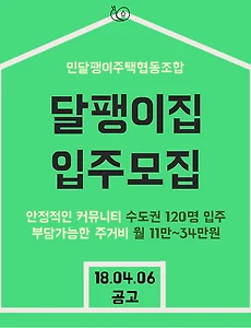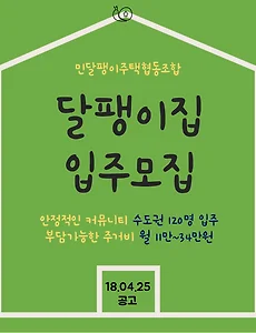 전체보기900 ★모집중★ 2018년 4월 달팽이집 추가 모집공고 (18.4.25 최신) 5월부터 달팽이집 모집 공고 및 신청은 민달팽이주택협동조합의 홈페이지에서 이루어집니다 다음 달에는 홈페이지에서 만나요 :D 홈페이지 ▶ https://minsnailcoop.com ◎ 조합원 가입 http://bit.ly/민달팽이가입하기◎ 입주 상담/신청 http://bit.ly/달팽이집입주과정◎ 예비조합원교육 신청 http://bit.ly/민달팽이예비조합원 조금 더 자세하게 설명 드려요 *** 조합원이 된다는 것은? 1) 민달팽이의 가치에 동의!2) 매달 운영비를 납부 (1만원 이상의 자율금액, 매달 cms로 자동이체)3) 출자금을 출자 ㅇ 기본 1구좌(=5만원) 출자 시 조합원이 됨 ㅇ 달팽이집에 입주할 '입주조합원'은 6구좌(=30만원) 출자 ㅇ 출자금은 계좌이체 (우리은행 1005-702-5826.. 2018. 4. 25. ★모집중★ 2018년 4월 달팽이집 추가 모집공고 (18.4.6최신) 조금 더 자세하게 설명 드려요 *** 조합원이 된다는 것은? 1) 민달팽이의 가치에 동의!2) 매달 운영비를 납부 (1만원 이상의 자율금액, 매달 cms로 자동이체)3) 출자금을 출자 ㅇ 기본 1구좌(=5만원) 출자 시 조합원이 됨 ㅇ 달팽이집에 입주할 '입주조합원'은 6구좌(=30만원) 출자 ㅇ 출자금은 계좌이체 (우리은행 1005-702-582614 민달팽이주택협동조합) ㅇ 계좌이체 시 반드시 '보내는사람'란에 '(이름)출자금'이라고 표시 (ex) (홍길동)출자금 ㅇ 일시불이 기본, but 분납도 가능! * 조합원 가입 신청 및 자세한 사항 ☞ http://bit.ly/민달팽이가입하기 *** 입주계획서를 쓴다는 것은? 민달팽이주택협동조합 '조합원'으로 함께 하기 위해, 함께 살기 위해 나는 어떤 사람.. 2018. 4. 6. [모집] 2018 월간 민달팽이 에디터 모집 1. 소개 민달팽이유니온과 민달팽이주택협동조합의 소식지 '월간 민달팽이' 를 함께 만들 회원, 조합원 여러분을 모집합니다. '월간 민달팽이' 는 지난 2014년 ‘월간 민유’ 9월 창간호를 시작으로 2017년 7월 '월간 민달팽이로' 변경, 작년 9월까지 매 월 회원들에게 민달팽이유니온과 민달팽이주택협동조합의 소식을 전달하는 회원 소식지로 자리 잡았습니다. 이제 단순히 단체의 주요 소식을 전달하는 의미를 넘어 회원들이 함께 글을 쓰고 이야기를 나누는 공간으로 나아가고자 합니다. 2. 월간 민달팽이 에디터가 하는 일 월간 민달팽이 에디터는 매 월 발행 될 소식지의 구성, 기획, 편집 을 논의합니다. 앞으로 만들어갈 소식지의 구성 및 기획부터 어떤 이야기를 담고 어떤 분들의 이야기를 담을지 함께 기획합니다... 2018. 4. 4. ★모집중★ 2018년 3월 달팽이집 추가 모집공고 (18.3.22최신) 1. 조합원들이 조합의 힘으로 만들어가는 집! 따라서 '조합원'으로 가입하셔야 합니다.2. 함께 사는 집입니다. 민달팽이가 무엇을 하는지 궁금하기도 하시죠? 같이 산다는 것은 어떤 것인지, 조합활동은 어떻게 하는지에 대해 함께 이야기하는 교육에 참여하셔야 합니다.3. 해당 집에 대해 '입주계획서'를 써주세요. 앞으로 내가 어떻게 살아갈지 함께 그리고 맞춰나가요! 입주를 위한 위의 3가지 필수 요건에 대한 자세한 사항은 아래와 같습니다. 1. 조합원이 된다는 것은? 1) 민달팽이의 가치에 동의!2) 매달 운영비를 납부 (1만원 이상의 자율금액, 매달 cms로 자동이체)3) 출자금을 출자 ㅇ 기본 1구좌(=5만원) 출자 시 조합원이 됨 ㅇ 달팽이집에 입주할 '입주조합원'은 6구좌(=30만원) 출자 ㅇ 출자금.. 2018. 3. 22. 이전 1 2 3 4 ··· 225 다음