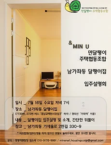 [민달팽이주택협동조합]/* 달팽이집 살이62 [달팽이집] 홍제천이 흐르는, 남가좌동 달팽이집 입주기 "마약 같은 우리 달팽이집으로 드루와 드루와" 홍제천이 흐르는, 남가좌동 달팽이집 입주기"마약 같은 우리 달팽이집으로 드루와 드루와" 글, 사진 : 김해랑님 14년 8월 8일, 진중했던 입주기 사실 예민해 낯선 곳에서 잠을 잘 이루지 못한다. 그런데 달팽이집에서 꿈만 같이, 단잠을 잤다. 그것도 앞으로 2인실 같은 방을 쓰게 될 금시루와 함께! 예비 룸메는 푹 잔 나머지 지각을 할 뻔했으나, 이곳 교통편을 잘 알고 있는 작은 방 소라님 덕에 곧잘 출근을 했다. 먼저 일어나는 벌레는 잡아먹힌다는 듯이 우리 집 달팽이들은 넉넉하게 자고 일어나는 대로 차례차례, 신기하게도 큰 불편 없이 자연스레 화장실 사용 순서도 정리된 것 같다. 나는 조금 일찍 깬 김에 달팽이집에서 한 길 건너 있는 홍제천을 따라 거닐었다. 오랜만에 따스한 햇살을 온 몸으로 느끼는데,.. 2014. 9. 5. 7.25일 달팽이집 입주자 워크숍 1차 후기 25일 금요일 저녁, 남가좌동 달팽이집에서는 입주신청자를 대상으로 한 첫 번째 워크숍이 있었습니다. 이 날 워크샵은 입주면접과는 별도의 과정으로 준비된 입주신청을 해주신 조합원들을 위한 교육이었어요. 사정으로 참석하지 못한 한분을 제외하고 모두 참석하셨습니다. 돈까스와 주먹밥을 준비했는데, 반응이 뜨거웠답니다! 시작 프로그램은 “나를 표현하는 포스터 그리기” 그리고 “달팽이집 도면에 원하는 대로 방 꾸미기” 였어요. 먼저 나를 표현하는 포스터에는 몇가지 아이템을 그려주신 분도 계시고, 자신의 모습을 초상화처럼 그려주신 분도 계셨고 현재 자기의 상황을 운동장 위에 달리고 있는 장면으로 비유해 그려 주신 분도 계셨어요. 신기했던건 참가자들 중 대다수가 고양이를 좋아하거나, 키우고 있거나, 키우고 싶어했다는 .. 2014. 7. 29. [민달팽이 주택협동조합] 7월 16일 7시 남가좌 달팽이집 입주 설명회 ■ 남가좌 달팽이집 입주 설명회 ■ - 일시 : 7월16일 수요일 저녁 7시 - 장소 : 남가좌동 달팽이집 (서울시 남가좌동 가재울로 2안길 330-9) - 내용 : 남가좌 달팽이집을 둘러보는 시간과 설명회 그리고 간단한 뒷풀이가 준비되어 있습니다.^^ - 문의 : 010-9176-9991 임소라 / minsnail.housingcoop@gmail.com * 입주 신청을 고민중이신 분 혹은 남가좌 달팽이 집에 관심이 있으신 조합원/비조합원 누구나 참석 가능 합니다. 댓글/메일/문자/전화로 모두 신청 가능합니다.^^ 많은 관심과 방문 부탁드립니다! : D 2014. 7. 14. [민달팽이 주택협동조합] 남가좌동 달팽이집 모집공고. 안녕하세요 민달팽이 주택협동조합입니다.조합원님들의 관심과 응원속에서 드디어 민달팽이주택협동조합의 첫번째 입주자 모집이 시작됩니다. 남가좌동 주거지에 위치한 달팽이집은 지어진지 얼마되지 않은 신축 건물입니다.홍제천이 바로 옆에 있어 산책이나 운동도 할 수 있는 여건이 충분하고 시장과 마트 그리고 버스정류장이 근처에 위치해 있어서 여러모로 편리하답니다.달팽이 집과 주변환경이 더 풍성한 입주조합원님의 삶을 만들어 낼 수 있기를 기대해봅니다. 민달팽이 주택협동조합의 첫번째 주택 남가좌동 달팽이집의 모습은 어떨지 지금 바로 공개합니다. ■ 모집 기간 : 7월 20일 24:00 까지 온라인 접수 신청 마감 ■ 모집 자격 : 6구좌 이상 출자한 조합원 누구나(입주 신청시 조합원 가입 가능) ■ 문의 : 010-917.. 2014. 7. 12. 이전 1 ··· 12 13 14 15 16 다음