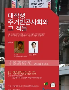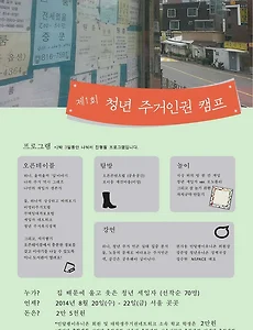 제1회 청년주거인권캠프가 8월 20일(수), 21일(목), 22일(금) 서울 곳곳에서 진행됩니다. 주거도 인권이라는 관점에서 청년 주거권의 실태, 주거불평등의 구조, 다양한 대안 탐색까지 이어지며 오픈테블, 강연, 탐방, 그리고 놀이 프로그램까지 다양하게 접목된 캠프에 놀러오세요! 참가대상 : 20세 - 39세의 청년 (선착순 70명)참가신청 : http://goo.gl/VEuI84 참가비 : 2만 5천원 (단, 민달팽이유니온 회원 및 대학생주거권네트워크 소속 학교 2만원) 자세한 사항은 댓글, 메시지 등 자유롭게 남겨주세요^^ 주최 : 대학생주거권네트워크, 민달팽이유니온